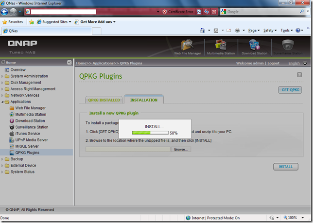 As the screenshot above shows the process of installing this SABnzbd+_0.4.11QPKG plug-in/package hanged at 50%. I reboot the NAS box, disabled SABnzbd+, reboot, removed Python package and reinstalled Pyton and SABnzbd+_0.4.11 but nothing helped. I even renamed the file as suggested in the support forms; still it did not helped. Tried with IE7 with WIndows XP; still it stopped at 50%.